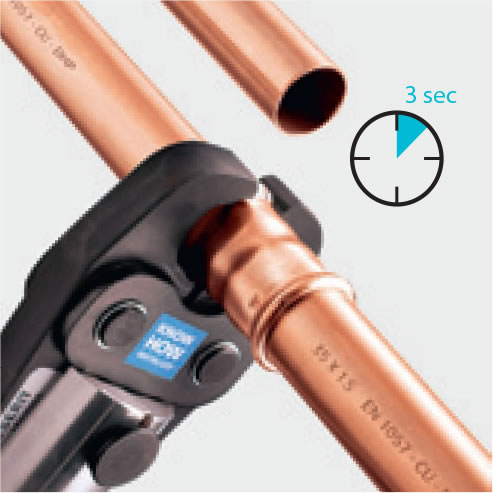 Efectuarea conexiunii este extrem de ușoară. Odată ce conducta debavurată a fost introdusă în fiting până la poziția de stop, canelura fălcii de presare este plasată pe conturul specificat și operația de presare este efectuată - rezultând o fixare permanentă prin presare. Riscul unei erori în timpul operației de presare este practic zero.